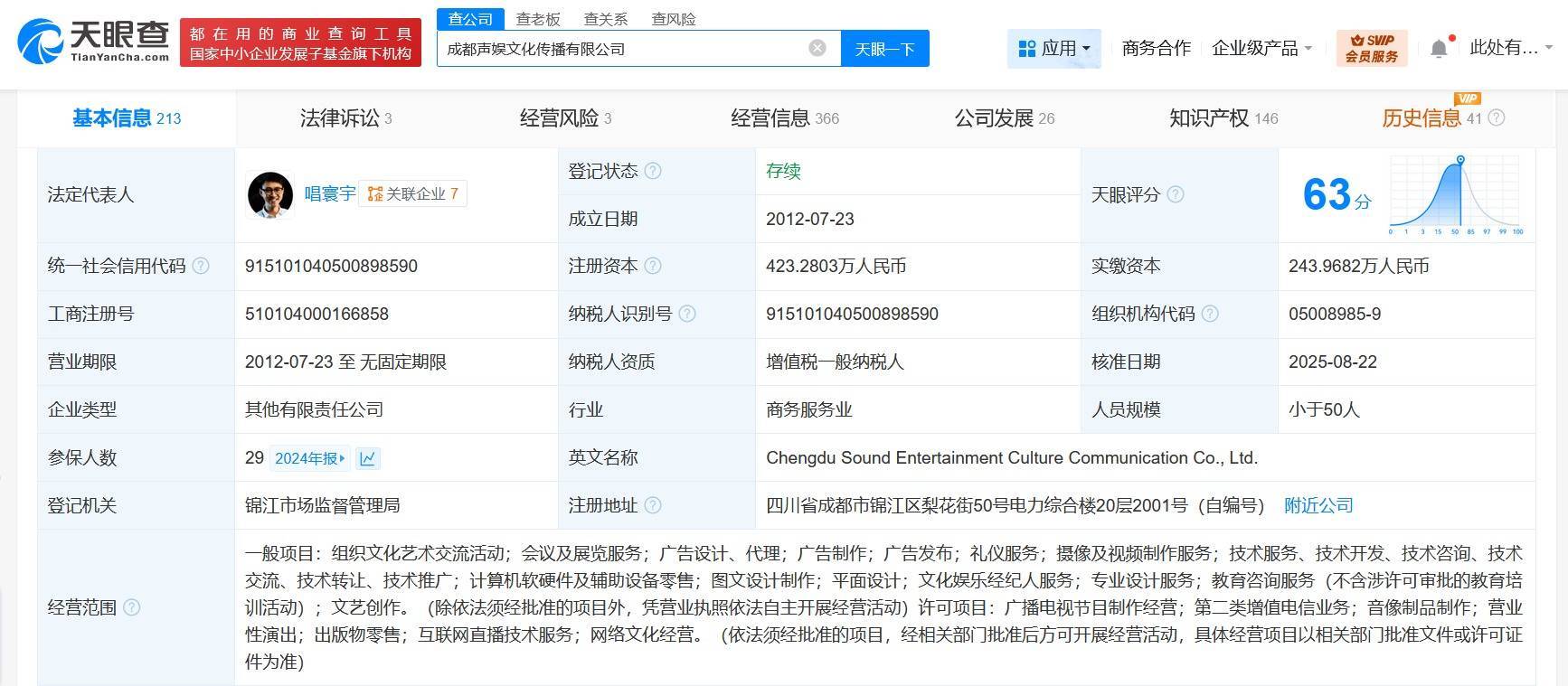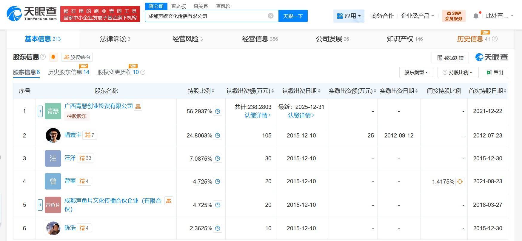 成都声娱文化传播有限公司成立于2012年7月,法定代表人为唱寰宇,经营范围含组织文化艺术交流活动、会议及展览服务、摄像及视频制作服务、文化娱乐经纪人服务、互联网直播技术服务等。股东信息显示,该公司现由广西青瑟创业投资有限公司、唱寰宇、成都声鱼片文化传播合伙企业(有限合伙)等共同持股。
