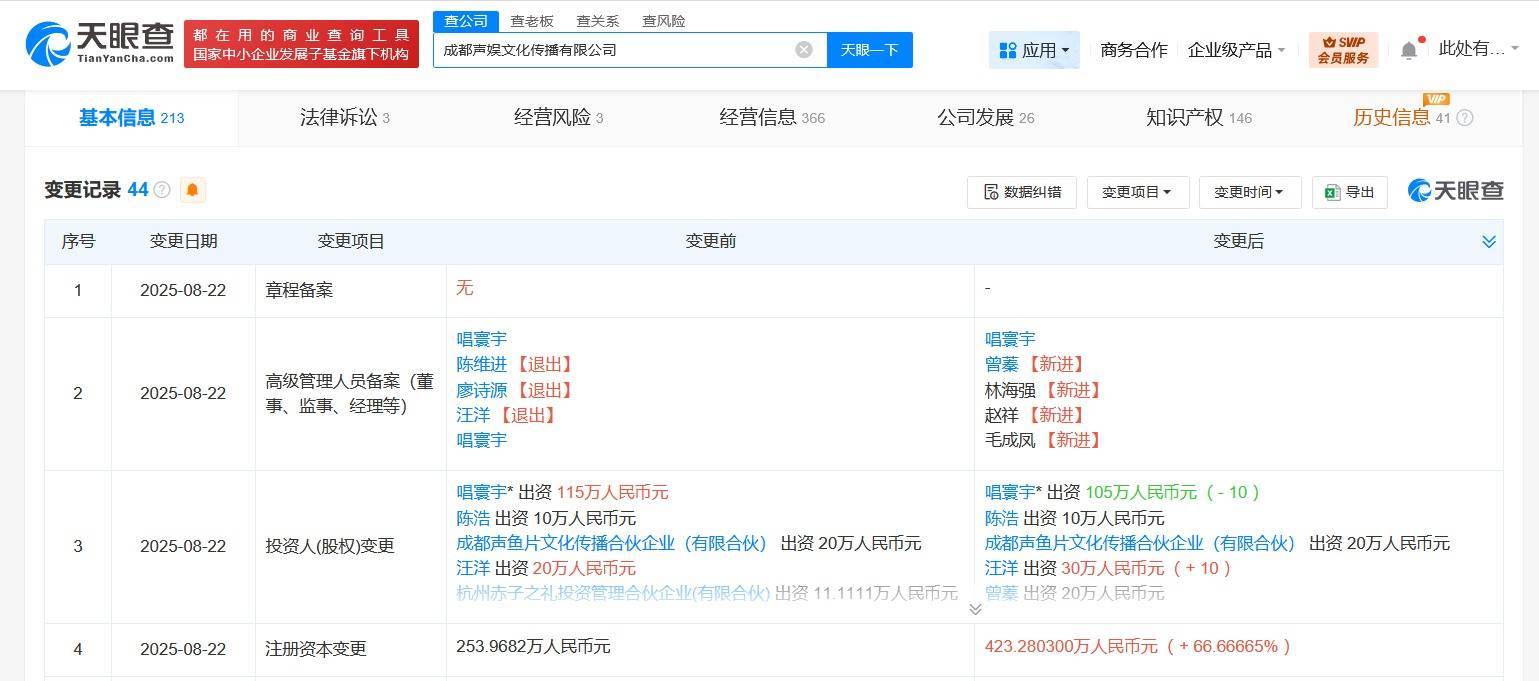 天眼查工商信息显示,近日,成都声娱文化传播有限公司发生工商变更,杭州赤子之礼投资管理合伙企业(有限合伙)、杭州和山前行投资合伙企业(有限合伙)、杭州嘉植投资管理合伙企业(有限合伙)、杭州普鲁同投资有限公司退出股东行列,注册资本由约253.97万人民币增至约423.28万人民币,增幅约67%,同时,多位主要人员也发生变更。